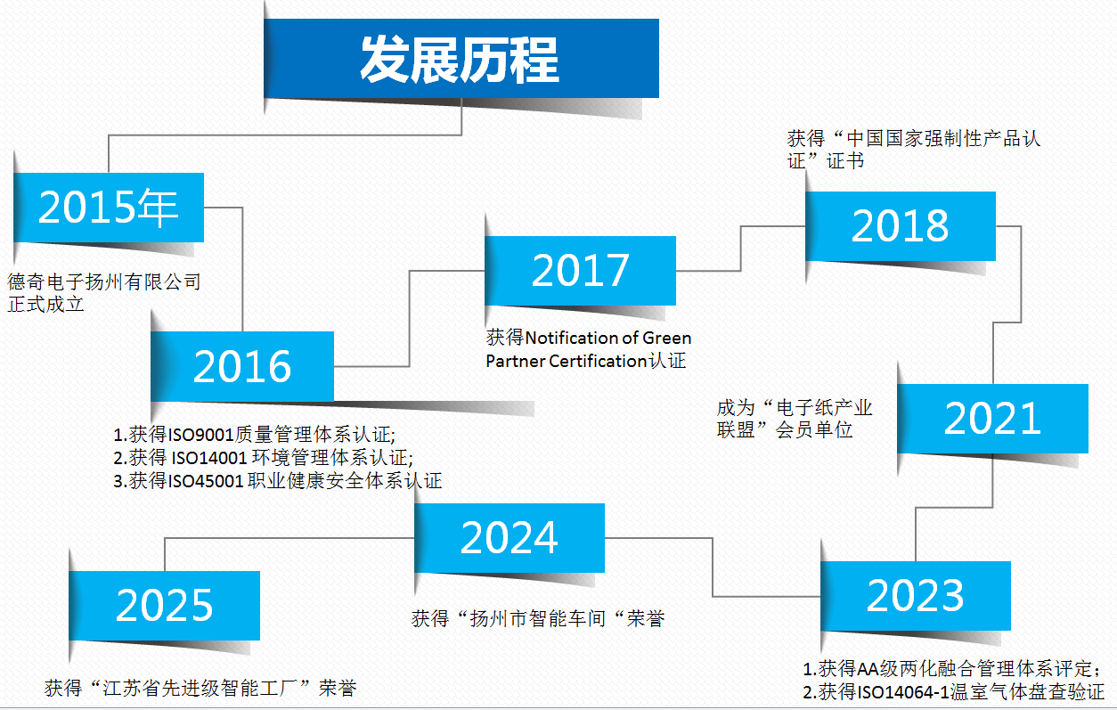 德奇电子扬州有限公司正式成立于2015年6月30日,由全球电子纸领导厂商EInk元太科技与振曜科技股份有限公司合资设立。